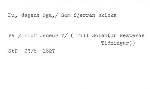 Du, dagens öga,/ Som fjerran skicka //// Av / Elof Jedeur ?/ ( Till Solen(Ur Westerås //// Tidningar)) //// StP 23/6 1827