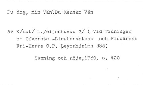 Du dog, Min Vän:Du Mensko Vän //// Av K/nut/ L./eijonhuvud ?/ ( Vid Tidningen om Öfverste -Lieutenantens och Riddarens Fri-Herre C.F. ;,eyonhjelms död) //// Sanning och nöje,1780, s. 420