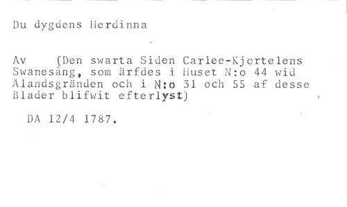 Du dygdens Herdinna //// Av (Den swarta Siden Carlee-Kjortelens //// Swanesång, som ärfdes i Huset N:o 44 wid Ålandsgränden och i N:ki 31 och 55 af desse Blader blifwit efterlyst) //// DA 12/4 1787.