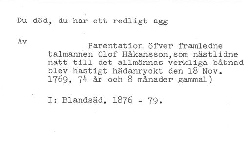 Du död, du har ett redligt agg //// Av Parentation öfver framledne //// talmannen Olof Håkansson,som nästlidne natt till det allmännas verkliga båtnad blev hastigt hädanryckt den 18 Nov. 1769, 74 år och 8 månader gammal) //// I: Blandsäd, 1876 - 79.