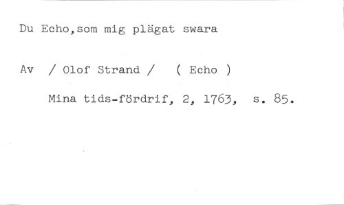 Du Echo,som mig plägat swara //// Av / Olof Strand / ( Echo ) //// Mina tids-fördrif, 2, 1763, s. 85.