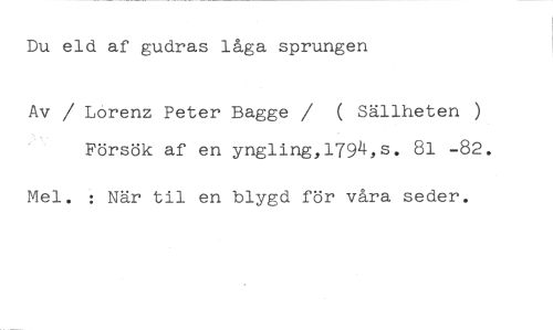 Du eld af gudras låga sprungen //// Av / Lorenz Peter Bagge / ( Sällheten ) Försök af en yngling,1794,s. 81 -82. //// Mel. : När til en blygd för våra seder.