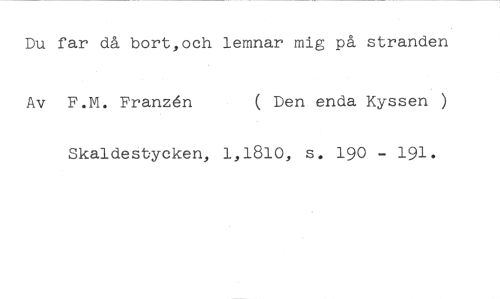 Du far då bort,och lemnar mig på stranden //// Av F.M. Franzén ( Den enda Kyssen ) //// Skaldestycken, 1,1810, s. 190 - 191.