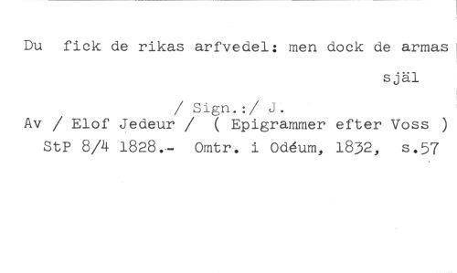 Du fick de rikas arfvedel: men dock de armas //// själ //// / Sign.:/ J. //// Av / Elof Jedeur / ( Epigrammer efter Voss ) //// StP 8/4 1828.— Omtr. i Od6um, 1832, s.57
