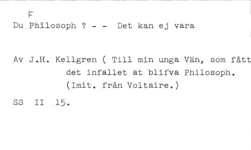 Du Philosoph ? - - Det kan ej vara //// Av J.H. Kellgren ( Till min unga Vän, som fått det infallet at blifva Philosoph. (Imit. från Voltaire.) //// SS II 15.