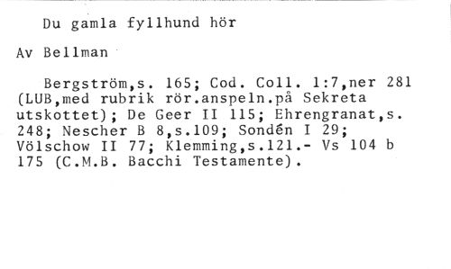 Du gamla fyllhund hör Av Bellman //// Bergström,s. 165; Cod. Coll. 1:7,ner 281 (LUB,med rubrik rör.anspeln.på Sekreta utskottet); De Geer II 115; Ehrengranat,s. 248; Nescher B 8,s.109; Sonden I 29; Völschow II 77; Klemming,s.121.- Vs 104 b 175 (C.M.B. Bacchi Testamente).