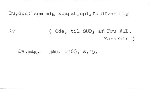 Du,Gud:'som mig skapat,uplyft öfver mig //// Av ( Ode, til GUD; af Fru A.L. //// Karschin ) //// Sv.mag. jan. 1766, s.'5.