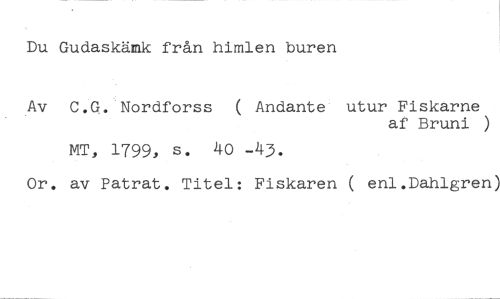 Du Gudaskämk från himlen buren //// C.G. Nordforss ( Andante utur Fiskarne //// af Bruni ) //// MT, 1799, s. 40 -43. //// Or. av Patrat, Titel: Fiskaren enl.Dahlgren)