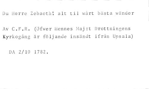 Du Herre Zebaoth! alt til wårt bästa wänder //// Av C.F.R. (Öfwer Hennes Maj:t Drottningens Kyrkogång är följande insändt ifrån Upsala) //// DA 2/10 1782.