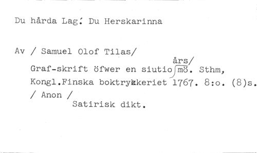 Du hårda Lag: Du Herskarinna //// Av / Samuel Olof Tilas/ års //// /Graf-skrift öfwer en siutio mö. Sthm, Kongl.Finska boktrykkeriet 1767. 8:o. (8)s. //// / Anon //// /Satirisk dikt.