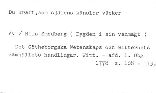 Du kraft,som själens känslor väcker //// Av / Nils Smedberg ( Dygden i sin vanmagt ) //// Det Götheborgska Wetenskaps och Witterhets Samhällets handlingar. Witt. - afd. 1. Gbg //// 1778 s. 108 - 113.