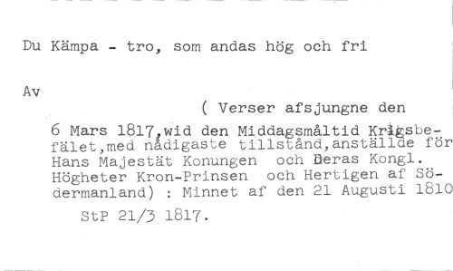 Du Kämpa - tro, som andas hög och fri //// ( Verser afsjungne den //// 6 Mars 1817,wid den Middagsmåltid Kriksbefälet,med nådigaste tillstånd,anställde för Hans Majestät Konungen och Deras Kongl. Högheter Kron-Prinsen och Hertigen af Södermanland) : Minnet af den 21 Augusti 1810 //// StP 21/3 1817.