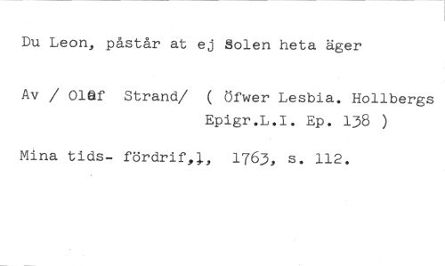 Du Leon, påstår at ej Solen heta äger //// Av / Olof Strand/ ( Öfwer Lesbia. Hollbergs //// Epigr.L.I. Ep. 138 ) //// Mina tids- fördrif,l, 1763, s. 112.