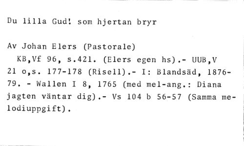 Du lilla Gud! som hjertan bryr //// Av Johan Elers (Pastorale) //// KB,Vf 96, s.421. (Elers egen hs).- UUB,V 21 o,s. 177-178 (Risell).- I: Blandsäd, 187679. - Wallen I 8, 1765 (med mel-ang.: Diana jagten väntar dig).- Vs 104 b 56-57 (Samma melodiuppgift).