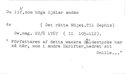 V //// Du lif,som höga Själar andas //// Av ( Det rätta Nöjet.Til Zephis) //// Sw.mag. 22/8 1767 ( II 105-112). //// tt Författaren af detta wackra ldestycke har så här, som i andra Skrifter,hedrat sit //// Snille..."