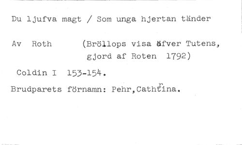 Du ljufva magt / Som unga hjertan tänder //// Av Roth (Bröllops visa dfver Tutens, //// gjord af Roten 1792) //// Coldin I 153-154. //// Brudparets förnamn: Pehr,Cath6na.