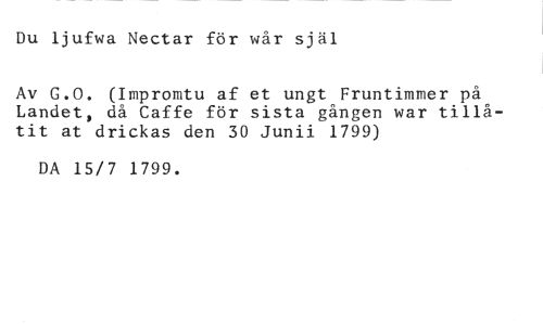 Du ljufwa Nectar för wår själ //// Av G.O. (Impromtu af et ungt Fruntimmer på Landet, då Caffe för sista gången war tillåtit at drickas den 30 Junii 1799) //// DA 15/7 1799.