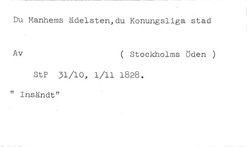 Du Manhems ädelsten,du Konungsliga stad //// Av ( Stockholms Öden ) //// StP 31/10, 1/11 1828. " Insändt"