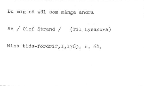 Du mig så wäl som många andra //// Av / Olof Strand / (Til Lysandra) Mina tids-fördrif,l,l 763, s. 64.