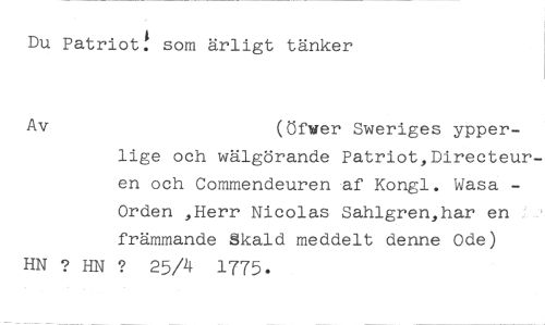 1 //// Du Patriot. som ärligt tänker //// Av (Öfwer Sweriges ypper- //// lige och wälgörande Patriot,Directeuren och Commendeuren af Kongl. Wasa Orden ,Herr Nicolas Sahlgren,har en främmande Skald meddelt denne Ode) //// HN ? HN ? 25/4 1775.