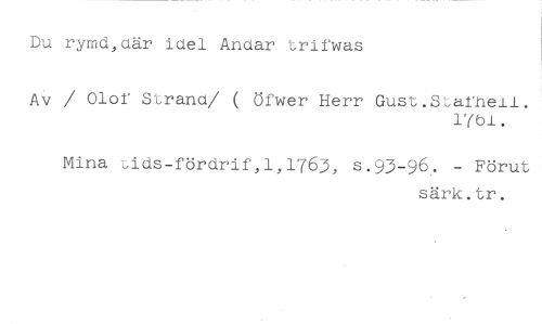 Du rymd,aär idel Andar trifwas //// Av / Olof Strand/ ( öfwer Herr Gust.Stafnell. //// 1761. //// Mina tids-fördrif,1,1763, s.93-96. - Förut //// särk.tr.