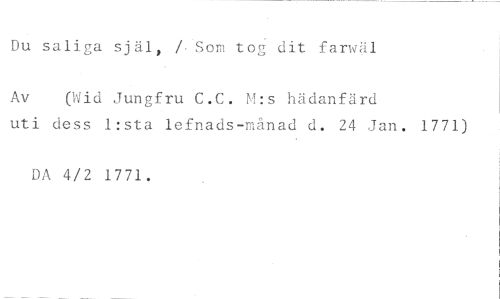 Du saliga själ, . Som tog dit fartgäl //// Av (Wid Jungfru C.C. M:s hädanfärd //// uti dess lasta lefnads-månad d. 24 Jan. 1771) //// DA 4/2 1771.