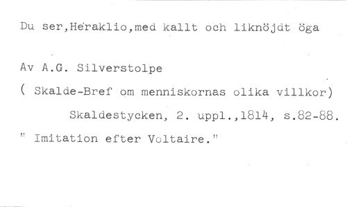 Du ser,Heraklio,med kallt och liknöjdt öga //// Av A.G. Silverstolpe //// ( Skalde-Bref om menniskornas olika villkor) Skaldestycken, 2. uppl.,1814, s.82-88. " Imitation efter Voltaire."