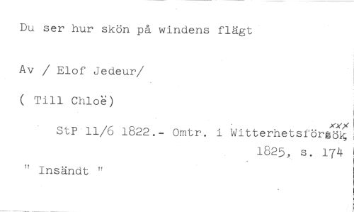 Du ser hur skön på windens flägt //// Av / Elof Jedeur/ ( Till Chlose) 1 //// StP 11/6 1822.- xxX //// " Insändt " Omtr, i Witterhetsförgöl; //// 1825, s. 174