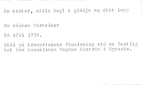 Du slutar, sälla Dag: i glädje nu ditt lopp //// Av rådman Marteleur DA 8/11 1779. //// Skål på kronprinsens födelsedag vid en festlig het hos handelsman Magnus Ekström i Uppsala.