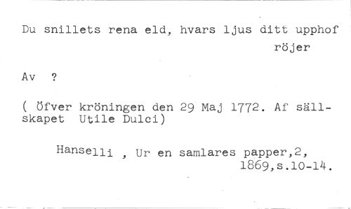 Du snillets rena eld, hvars ljus ditt upphof //// röjer //// Av //// ( Öfver kröningen den 29 Maj 1772. Af sällskapet Utile Dulci) //// Hanselli , Ur en samlares papper,2, //// 1869,s.10-14.