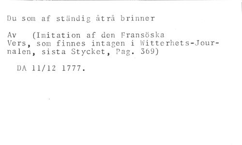 Du som af ständig åtrå brinner //// Av (Imitation af den Fransöska //// Vers, som finnes intagen i Witterhets-Journalen, sista Stycket, Pag. 369) //// DA 11/12 1777.