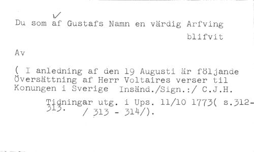 Du som af Gustafs Namn en värdig Arfving //// blifvit //// Av //// ( I anledning af den 19 Augusti är följande Översättning af Herr Voltaires verser til Konungen i Sverige Insänd./Sign.:/ C.J.H. //// TI.dningar utg. i Ups. 11/10 1773( s.312- . / 313 - 314/).