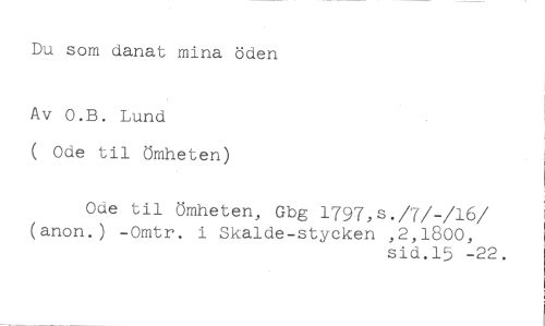 Du som danat mina öden //// Av O.B. Lund //// ( Ode til Ömheten) //// Ode til ömheten, Gbg 1797,s./7/-/16 //// /(anon.) -Omtr. i Skalde-stycken ,2,1800, //// sid.15 -22.