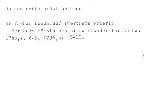 Du som detta bröst uptände //// Av /Johan Lundblad/ (Werthers Frieri) //// Werthers första och sista stunder för Lotta. //// 1786,s. 6-9, 1796,s. ;5-.10.