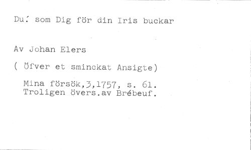 Du: som Dig för din Iris buckar //// Av Johan Elers //// ( öfver et sminckat Ansigte) //// Mina försök,3,1757, s. 61. //// Troligen övers.av Br6beuf.