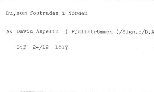 Du,som fostrades i Norden //// Av David Aspelin ( Fjällströmmen )/Sign.:/D.A StP 24/12 1817
