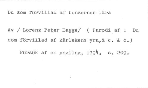 Du som Förvillad af bonzernes lära //// Av / Lorenz Peter Bagge/ ( Parodi af : Du som förvillad af kärlekens yra,& c. & c.) //// Försök af en yngling, 1794, s. 209.