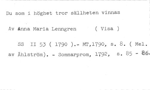 Du som i höghet tror sällheten vinnas //// Av Anna Maria Lenngren ( Visa ) //// Ss II 53 ( 1790 ).- MT,1790, s. 8. ( Mel. //// av Åhlström). Sommarprom, 1792, s. 85 {86.