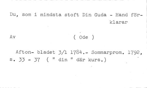 Du, som i mindsta stoft Din Guda - Hand för- //// klarar //// Av ( Ode ) //// Afton- bladet 3/1 1784.- Sommarprom. 1792, s. 33 - 37 ( " din " där kurs.)