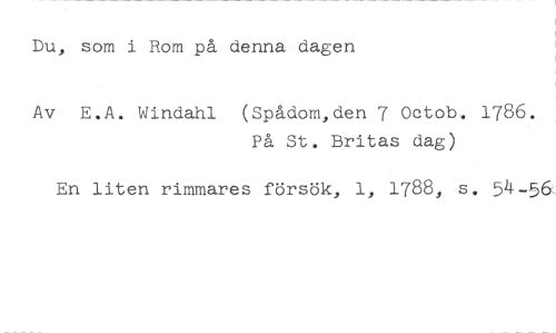 Du, som i Rom på denna dagen //// Av E.A. Windahl (Spådom,den 7 Octob. 1786. //// På St. Britas dag) //// En liten rimmares försök, 1, 1788, s. 54-56