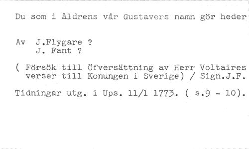 Du som i åldrens vår Gustavers namn gör heder' //// Av J.Flygare J. Fant ? //// ( Försök till Öfversättning av Herr Voltaires verser till Konungen i Sverige) / Sign.J.F. //// Tidningar utg. i Ups. 11/1 1773. ( s.9 - 10).