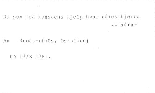 Du som med konstens hjelp hwar dåres hjerta //// -- sårar //// Av Bouts-rim6s. Oskulden) //// DA 17/8 1781.