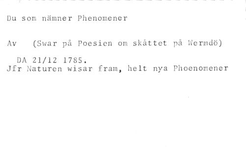 Du som nämner Phenomener //// Av (Svar på Poesien om skåttet på Wermdö) //// DA 21/12 1785. //// Jfr Naturen wisar fram, helt nya Phoenomener