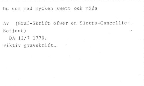 Du som med mycken svett och möda //// Av (Graf-Skrift öfwer en Slotts-CancellieBetjent) //// DA 12/7 1770. //// Fiktiv gravskrift.