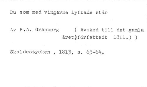 Du som med vingarne lyftade står //// Av P.A. Granberg ( Avsked till det gamla //// åretOförfattadt 1811.) ) //// Skaldestycken , 1813, s. 63-64.