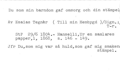 Du som min barndom gaf omsorg och din stämpel //// Av Esaias Tegnér ( Till min Hembygd )/Sign.:, //// T-r. //// StP 29/6 1804.- Hanselli,Ur en samlares papper,l, 1868, s. 146 - 149. //// Jfr Du,som mig var så huld,som gaf mig smaken //// stämpel.