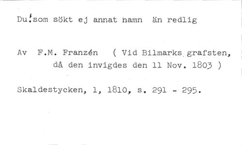 Du.som sökt ej annat namn än redlig //// Av F.M. Franzén ( Vid Bilmarks_grafsten, //// då den invigdes den 11 Nov. 1803 ) //// Skaldestycken, 1, 1810, s. 291 - 295.