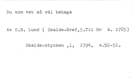 Du som vet så väl behaga //// Av O.B. Lund ( Skalde-Bref,5.Til Hr W. 1785) Skalde-stycken ,l, 1794, s.59-51.