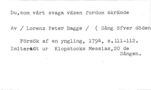 Du,som vårt svaga väsen fordom skrämde //// Av / Lorenz Peter Bagge / ( Sång öfver döden Försök af en yngling, 1794, s.111-112. //// Imiteradt ur Klopstocks Messias,20 de //// Sången.