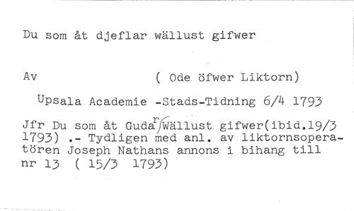 Du som åt djeflar wällust gifwer //// Av ( Ode öfwer Liktorn) //// Upsala Academie -Stads-Tidning 6/4 1793 //// Jfr Du som åt GudaNällust gifwer(ibid.19/3 1793) .- Tydligen med anl. av liktornsoperatören Joseph Nathans annons i bihang till nr 13 ( 15/) 1793)
